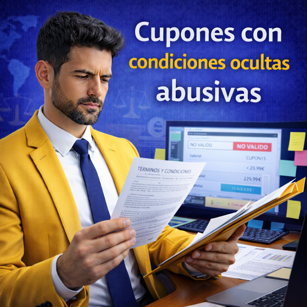 El escenario típico es una compra online en la que el cupón se promociona en banner, email o redes, pero al introducirlo el sistema exige un mínimo no anunciado o excluye el producto “sin explicación clara”.