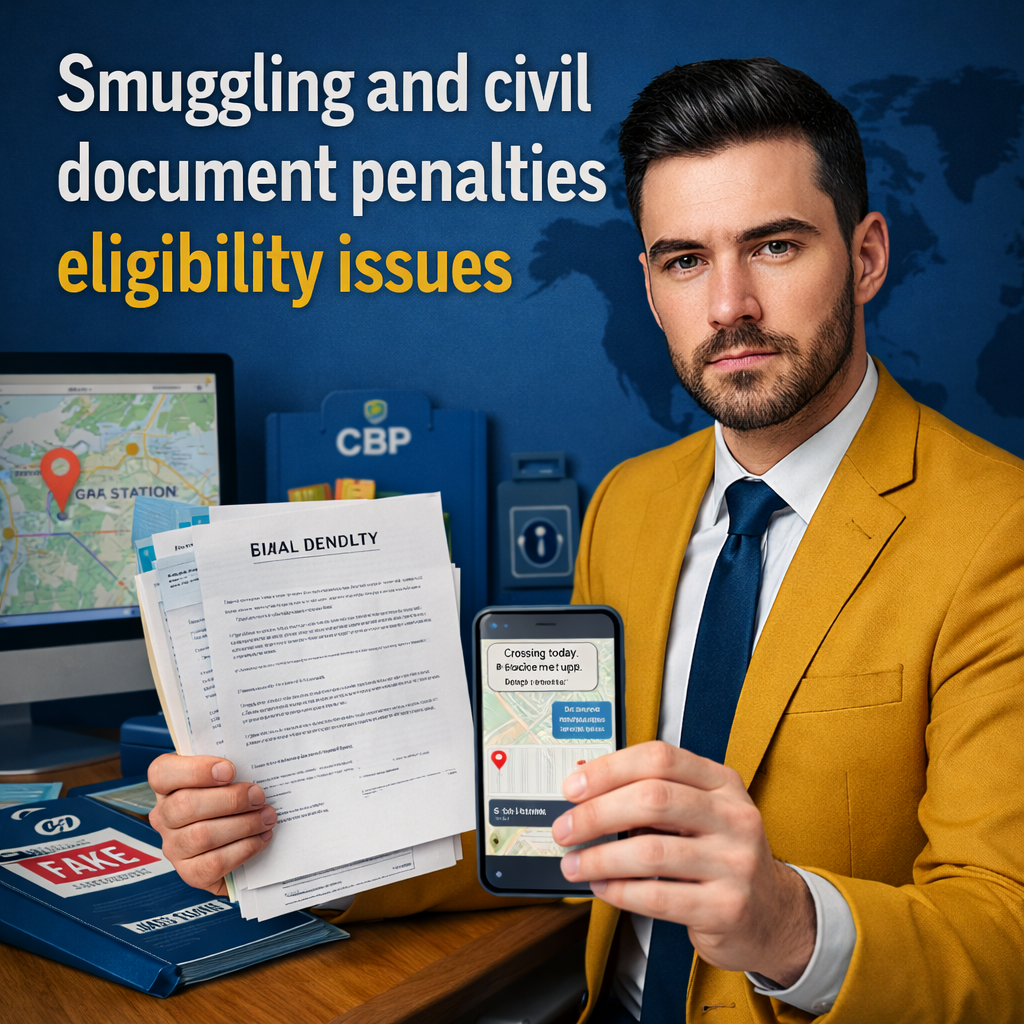 Smuggling issues often affect family-based contexts where someone helped a relative cross or avoid inspection. Civil document penalty issues often affect applicants with a prior administrative finding under INA 274C related to false documents. Both can surface during visas, adjustment, re-entry, or benefit applications requiring admissibility.