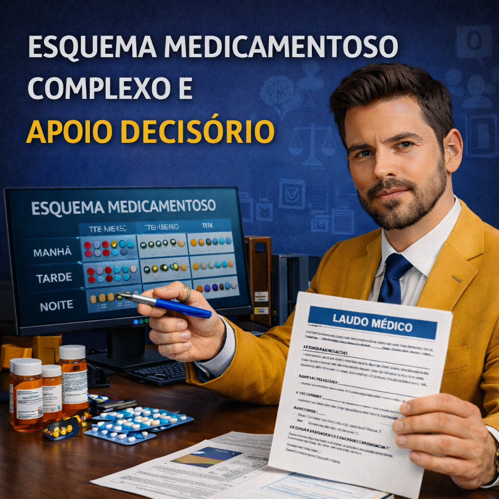 Um esquema medicamentoso é considerado “complexo” quando exige múltiplas drogas, horários específicos, monitoramento constante e ajustes frequentes, com impacto funcional relevante. O ponto central não é a quantidade de remédios em si, mas a repercussão na capacidade de entender, deliberar e executar escolhas com segurança.