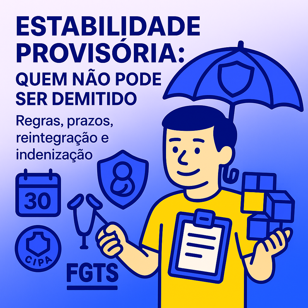 A estabilidade provisória é uma garantia legal que protege o trabalhador da demissão arbitrária em situações específicas. Ela não é permanente, mas tem um período definido em lei, durante o qual o empregador não pode demitir sem justa causa. O objetivo é preservar direitos de empregados em condições de vulnerabilidade (como gestantes e acidentados) ou que exercem funções coletivas (como dirigentes sindicais ou membros da CIPA).