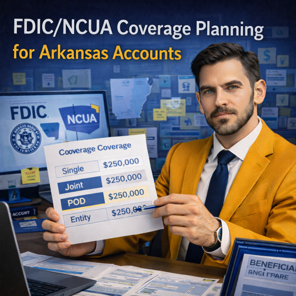 FDIC/NCUA coverage planning in Arkansas is mostly about clean account titling, accurate beneficiaries, and understanding how category totals aggregate at each institution. Small documentation issues can compress coverage and create payout delays in high-balance situations.