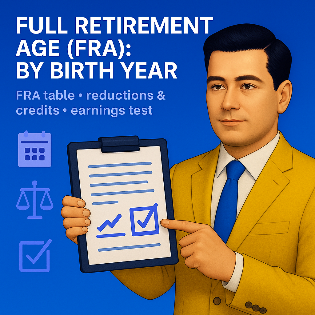 Your Full Retirement Age is the central hinge of Social Security planning. It sets the benchmark for the unreduced benefit, governs the earnings test, and frames the trade-off between taking an earlier, smaller check or a later, larger one via DRCs. Use the FRA table and SSA’s calculators, consider your health and household coordination (spousal/survivor), watch the annual earnings limits if working before FRA, and target a claiming age that fits both cash-flow and longevity goals. 41