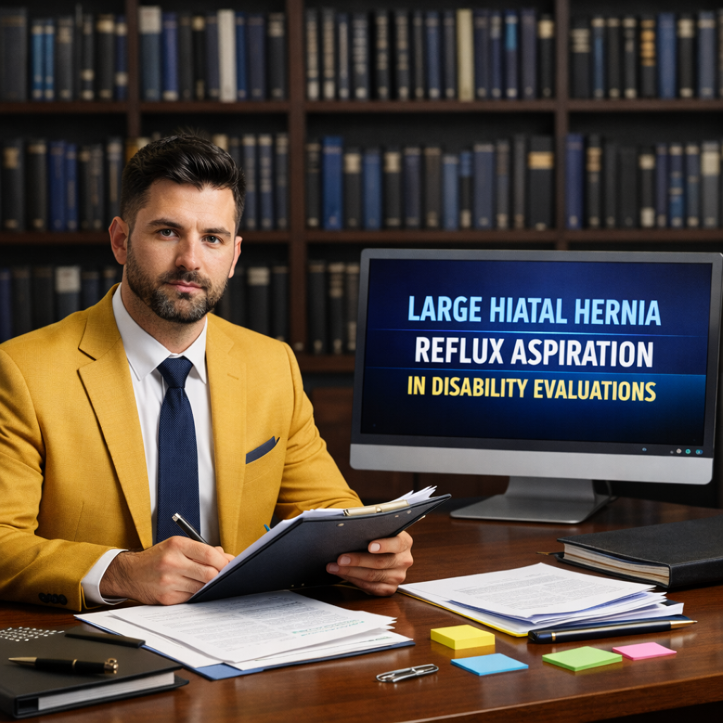Large hiatal hernia with reflux and aspiration sits at the intersection of gastroenterology, pulmonology and disability law, and evaluations are strongest when each of these elements is clearly represented in the file.
