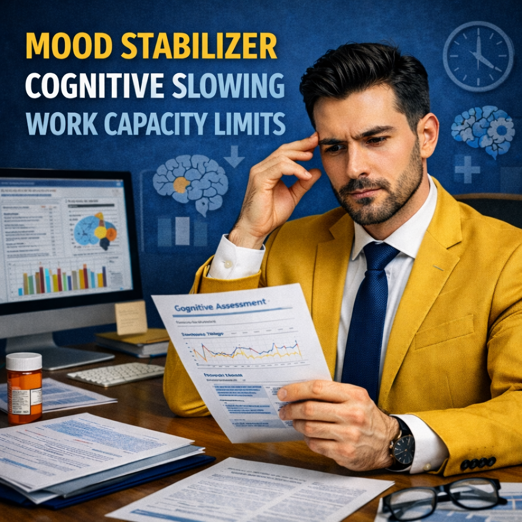A warehouse supervisor with a long history of bipolar disorder is maintained on a mood stabilizer, then experiences progressively slowed thinking after a dose increase. Work errors appear in inventory counts and scheduling, and safety checklists are missed. The treating clinician documents persistent slowed processing and reduced attention despite dose adjustment attempts, while pharmacy records show consistent use. A disability claim is supported by treatment notes, a functional capacity statement describing reduced pace and mental endurance, and employer records showing performance changes without misconduct findings.
