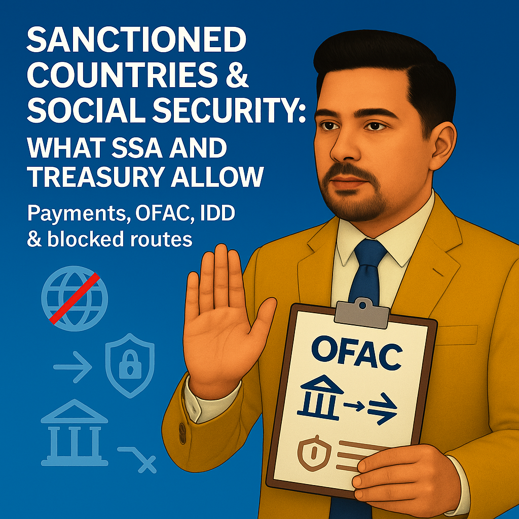 This guide explains how U.S. Social Security benefits interact with U.S. Treasury sanctions when the beneficiary lives in, travels to, or attempts to bank in a sanctioned or otherwise restricted country/region. It focuses on Title II benefits (retirement, survivors, disability) and the mechanics of international payments. It is written for beneficiaries, family members, and representative payees outside the United States.