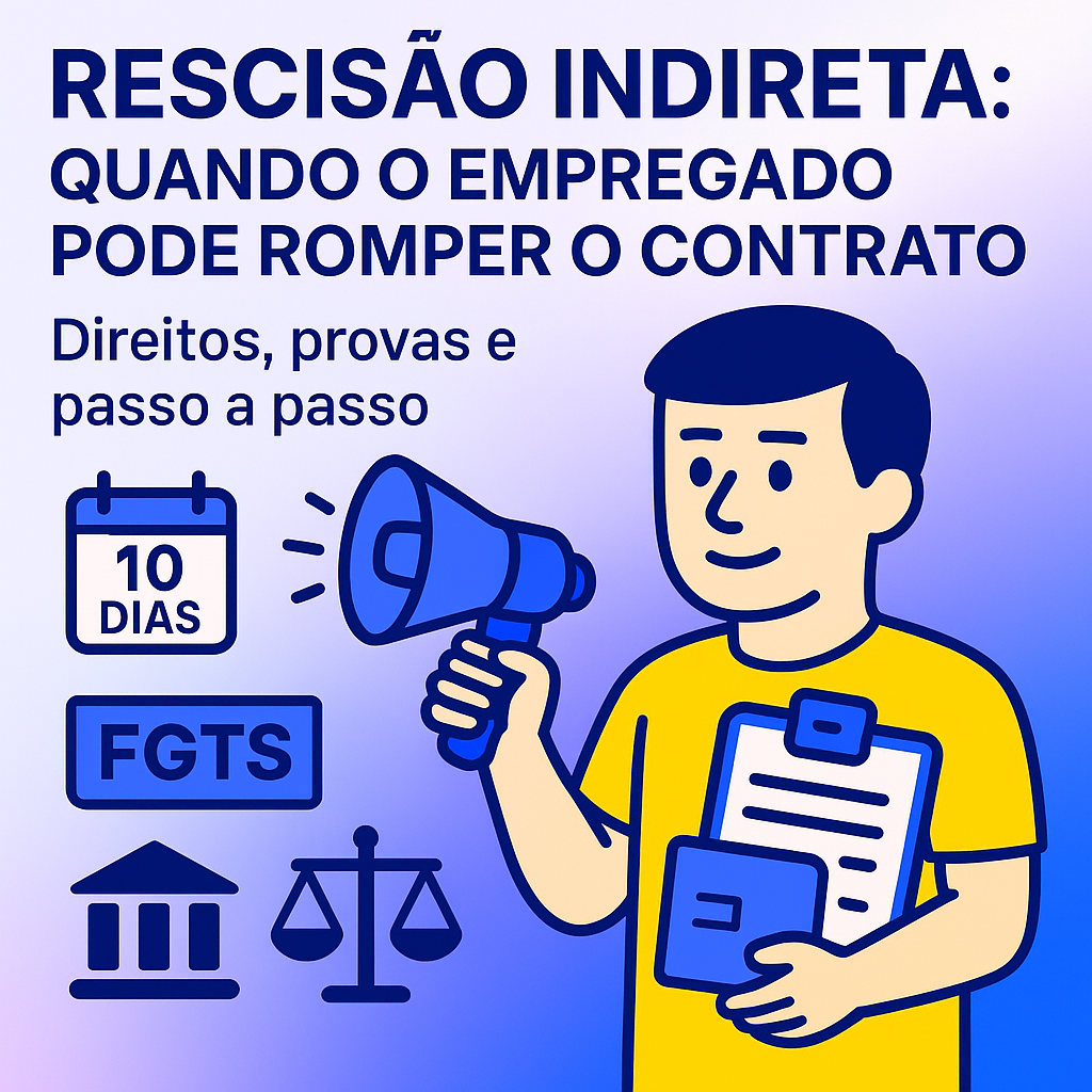 A rescisão indireta é a “justa causa do empregador”. Ela ocorre quando a empresa pratica falta grave que torna inviável a continuidade do contrato, permitindo que o empregado rompa o vínculo e receba as mesmas verbas de uma dispensa sem justa causa (aviso-prévio, férias e 13º proporcionais, saque do FGTS e multa de 40%, além de seguro-desemprego se preencher os requisitos). A base legal está no art. 483 da CLT, que lista hipóteses como: descumprimento de obrigações contratuais (atraso salarial/FGTS), rigor excessivo, perigo manifesto, ofensas à honra e agressões, exigir serviços ilegais ou alheios ao contrato, e redução artificial do trabalho por peça/tarefa. Em regra, o reconhecimento é judicial; fora de situações muito específicas, não é seguro abandonar o emprego sem antes ajuizar o pedido.