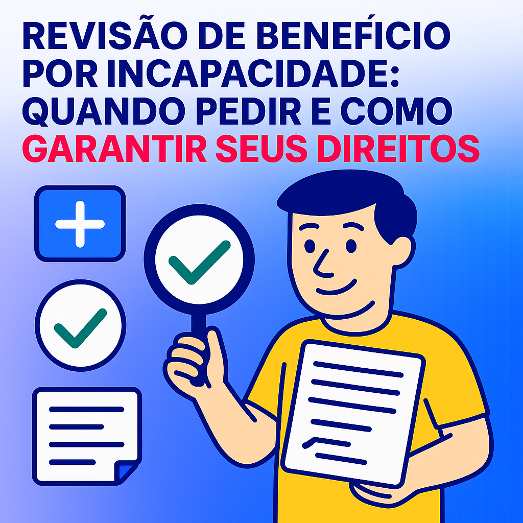 A revisão de benefício por incapacidade é o procedimento – administrativo ou judicial – destinado a corrigir erros de cálculo, ajustar parâmetros legais ignorados no ato concessório, adequar o benefício a novas provas médicas ou documentais e, em hipóteses específicas, transformar um benefício em outro mais adequado (p.ex., auxílio por incapacidade temporária convertido em aposentadoria por incapacidade permanente). No Regime Geral de Previdência Social (RGPS), os principais benefícios relacionados à incapacidade são: auxílio por incapacidade temporária (antigo auxílio-doença), aposentadoria por incapacidade permanente (antiga aposentadoria por invalidez) e o auxílio-acidente (indenizatório, quando há sequela que reduz a capacidade laboral).