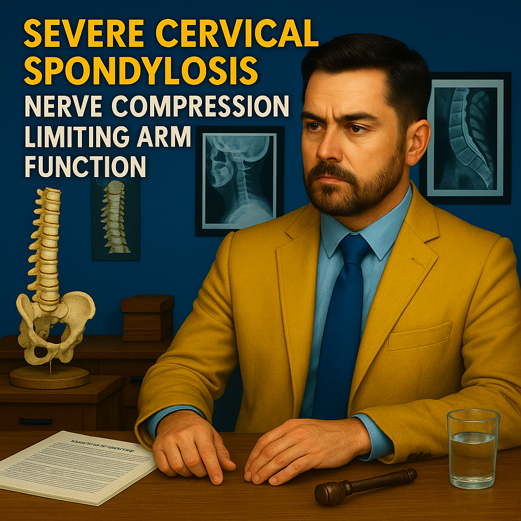 Benefit and legal systems are less concerned with the word “spondylosis” and more concerned with how it affects function. Severe cervical spondylosis with nerve root compression can limit:
